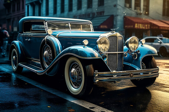 Concept art vintage luxury blue car drive on old  street, generative ai