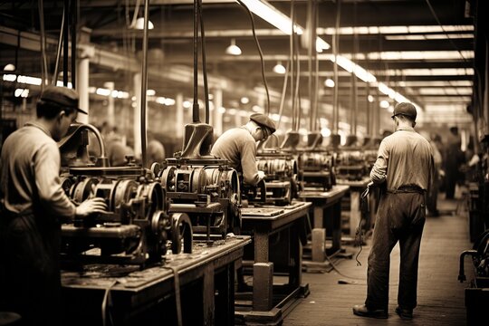 A black and white photo with sepia tones captures a 1920s industrial assembly line, showing a diverse group of men and women focused on their tasks amidst vintage machinery, evoking an era of early