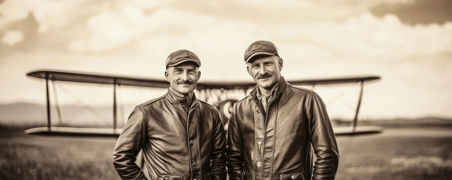 Vintage 1920s aircrew in leather aviator jackets, standing beside an old biplane