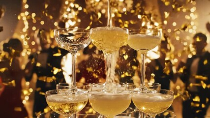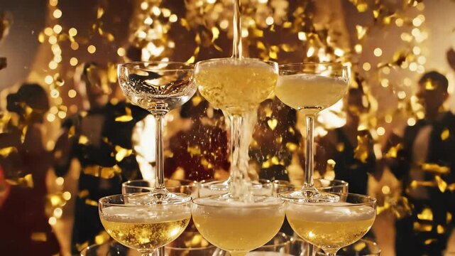 Luxurious 1920s Champagne Tower Pour with Golden Confetti and Bokeh - AI Generated