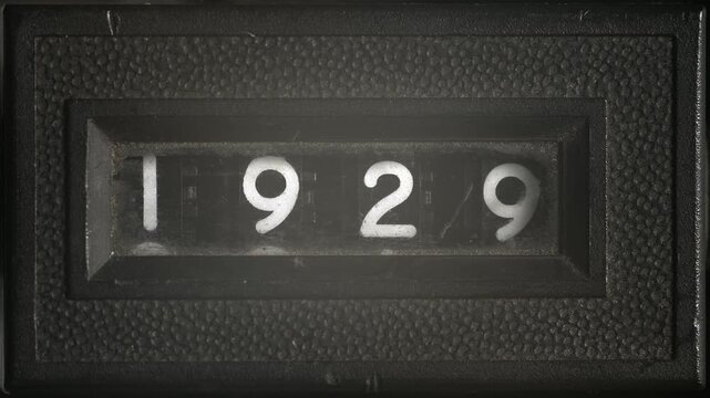 Vintage counter scrolls from 1926 to 1929, slowly landing on 1929. Retro numeric display symbolizing history, countdown, and the onset of the Great Depression era.