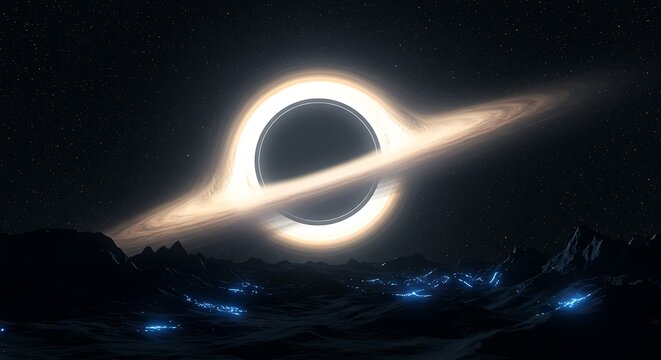 Black hole horizon bending starlight above alien terrain - view 193 | Stunning Photography & Visuals