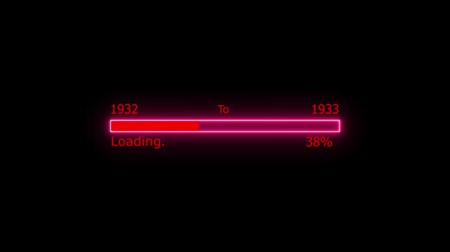 Loading 100 percent complete progress bar digital interface technology modern design white color animation. New year 1932 to 1933 loading animation. Neon bright rectangle frame black background.