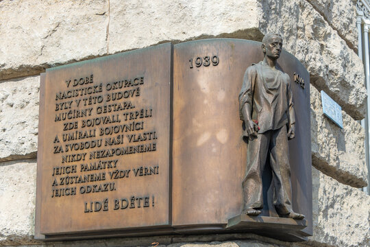 A memorial plaque on the corner of Petschkuv palac, commemorating the WWII victims of the Gestapo and Reinhard Heydrich, 1939 - 1945. Prague.