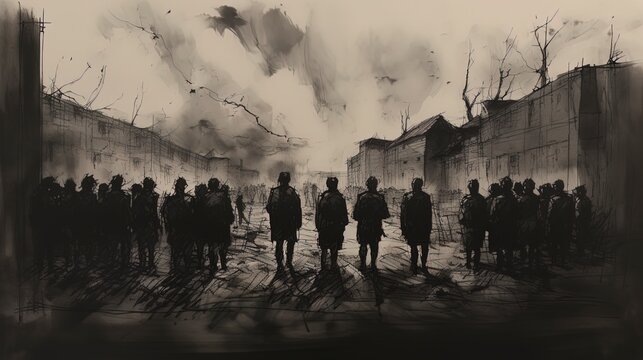 Dark WWII prison camp with prisoners as silhouettes illustration (1939-1945)