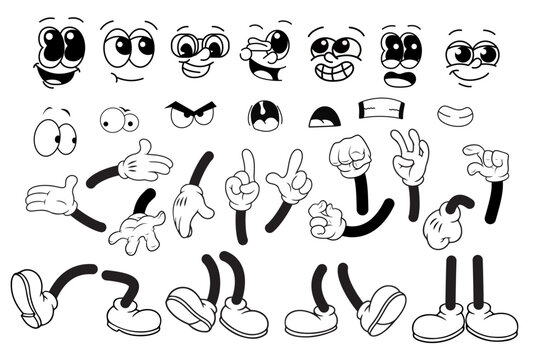 Set of vintage mascot elements. Line icons of arms, legs and facial expressions to create character in 30s style. Retro body parts. Cartoon outline vector collection isolated on white background