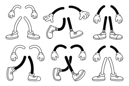 Vintage cartoon hands in gloves and feet in shoes.Comic hand gestures and walking legs vector set. Cute animated characters body parts. Set of retro cartoon mascot characters.