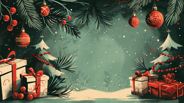 A flyer with a retro 1940s holiday theme, showcasing elegant illustrations of vintage ornaments, a classic Christmas tree, and wrapped gifts.