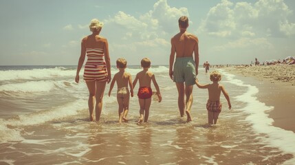 Vintage retro photography of an american family at the beach in the fifties , 1950s summer holiday historical image
