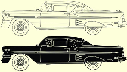 1958 Impala,Vector classic car illustration coloring book page for adult drawing. Paper, outlines vehicle. Graphic element. Wheel. Black contour sketch.
