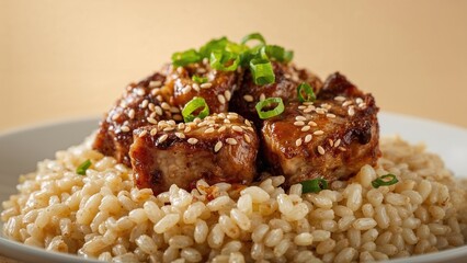 Grilled pork or beef with rice porridge topped with green onions and sesame seeds. 1962