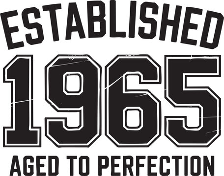 A distressed vintage graphic celebrating the year 1965 with the phrase 'Established 1965 Aged to Perfection'.