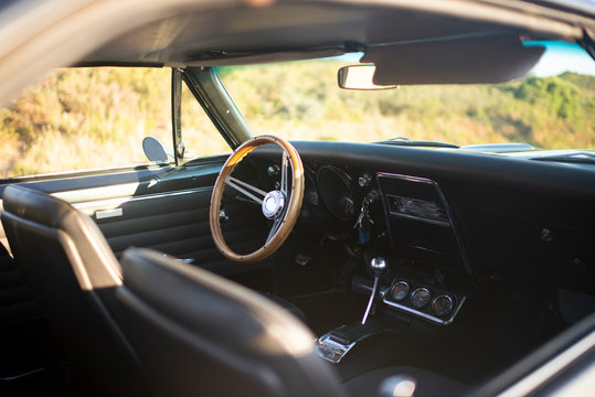 A classic 1967 Shelby GT500 Fastback, classic blue with white stripes, doing a burnout on a deserted road, raw power, action