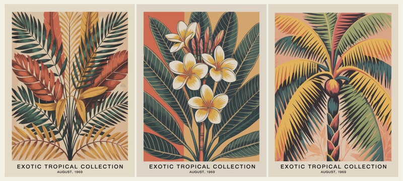 Retro botanical triptych from August 1969 featuring palm fronds and plumeria flowers in warm tropical earth tones.