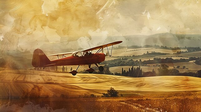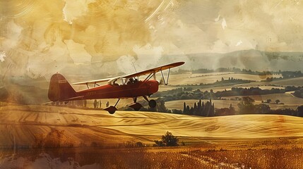 A vintage 1970 airplane soaring over the golden fields of Tuscany, bathed in the warm glow of a setting sun, rendered in soft watercolor tones