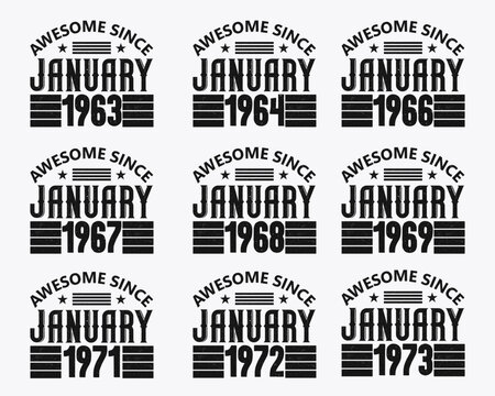 Awesome Since January design set. Birthday quote celebration Typography bundle. 1973, 1964, 1966, 1967, 1968, 1969, 1971, 1972, 1963 Awesome Since January