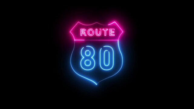 Glowing neon Route 80 text icon with alpha channel.  .4k video motion graphic animation. Route 80 shape symbol. Highway icon.