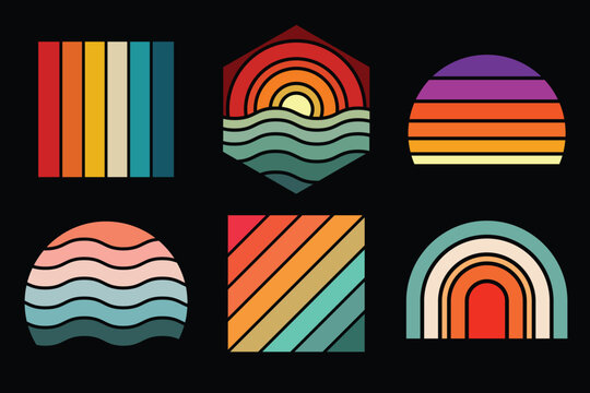 Vintage sunset logo or t shirt vector template set, 80's style background for your print on demand product design.