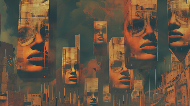 Depressed white-collar workers marching to their daily office jobs. Conceptual illustration with a dark, dystopian feel, like George Orwell's 1984 or Metropolis.