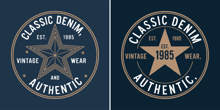 Vintage denim star badge emblem with retro typography for authentic apparel, est 1985 clothing insignia, classic logo for t shirt design