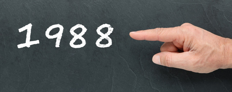 1988 text with screen effects of technological failures. Concept of counting years. Past year technology concept on black background.