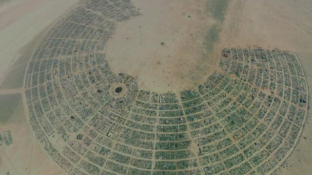 Aerial view of Black Rock City often abbreviated to BRC is the name of the temporary town created by Burning Man participants located since 1991 at in northwestern Nevada 4k high resolution animation