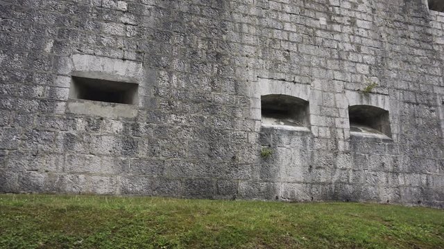 Port firing holes in Military fort built of stone from 19th century, Fort Kluze in Bovec, Slovenia was built by Austrian Army to guard a mountain pass in the Alps against Italian and French armies