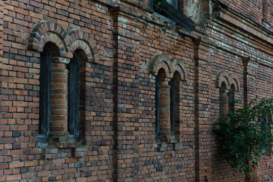 Vertical, narrow windows of a brick stable. 19th century building