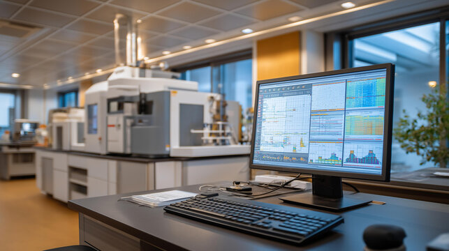 NMR spectrometers analyze molecular structures in a spectroscopy suite with magnets humming probes inserted spectra displaying on screens and samples in tubes nearby shown