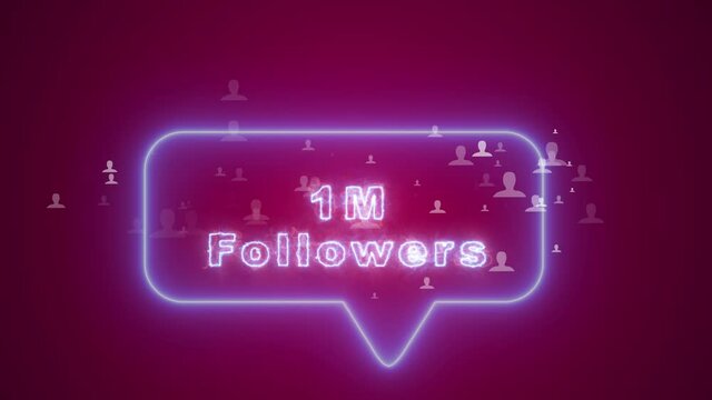 Neon 1m text effect video motion on black background. Glowing sign effect florescent text for social media follow subscription motion. 4k