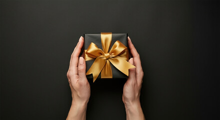 First person top view photo of hand giving black giftbox with golden satin ribbon bow on isolated black background with empty space
