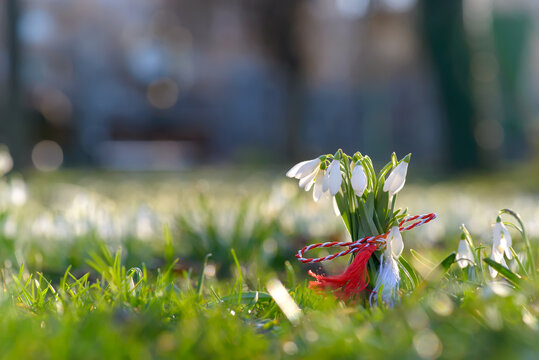 Snowdrops and small yarn dolls martenitsa or martishor. March 1st - traditional trinket, Baba Marta Day - Bulgarian holiday. Beginning of spring, springtime concept