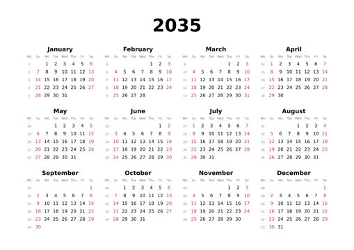 Kalender 2030 mit Wochenzählung, englisch, elegant, erster Wochentag ist Sonntag, Querformat
