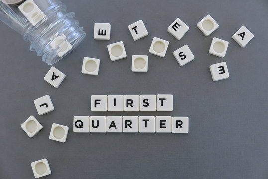Top view image text FIRST QUARTER on office desk. First quarter concept.