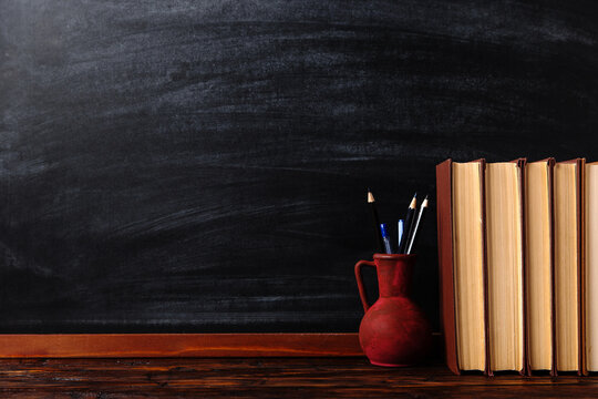 Books, pens and pencils in a jug on the table. Against the background of the chalkboard. Copy space.