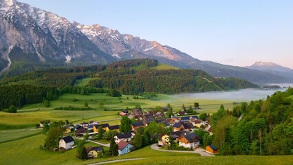 Summer austrian landscape with Grimming mountain (2.351 m), an isolated peak in the Dachstein Mountains, view from small alpine village Tauplitz, Styria, Austria in 4k