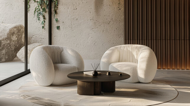 Two arm chairs in a living room with a blank painting on the wall