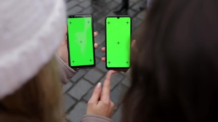 Close up of a two woman's hand holding a mobile telephone with a vertical green screen in street and old town of Prague chroma key smartphone technology cell phone street touch message display hand