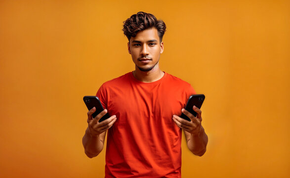 boy holding two cell phones on a yellow background