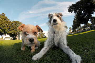Two adorable cute dogs meet in park. Curios pets sniff each other making friends