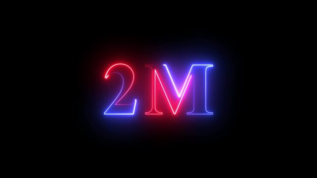 Abstract Glowing Neon Light 2 Millions Letter Icon Animation.2 Million achievement for social media videos .2 M million neon glowing text animation. Glowing 2M Typography Banner