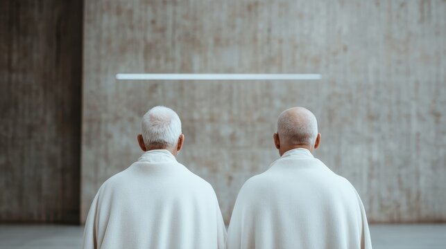 Two elderly men in white robes sit in quiet reflection, embodying serenity and wisdom in a minimalist setting that suggests deep thoughts and shared experiences.