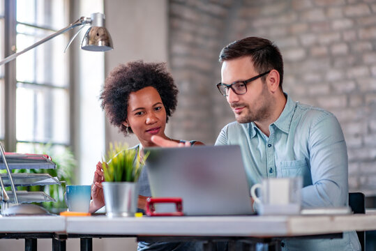 Mid aged Latin male manager mentor teaching young Asian female worker looking at laptop discussing corporate strategy in teamwork, working on computer in office at international team meeting.