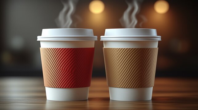 Two coffee cups with brown and white paper sleeves vector illustration, front view isolated background close-up, high-resolution insanely detailed professional color grading