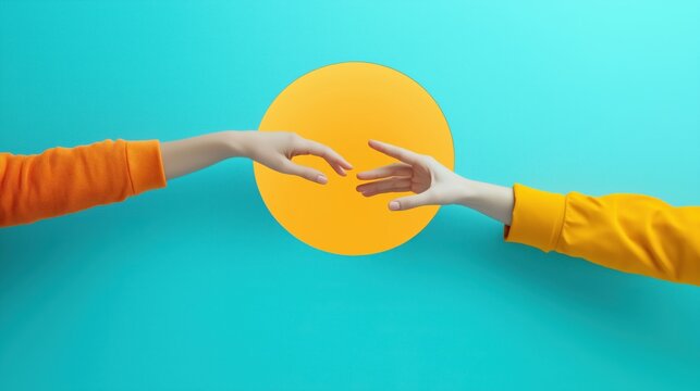 Two hands reaching through minimalist circular frame on vibrant blue background with contrasting yellow sleeves connection and creativity concept