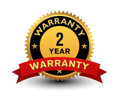Heavy powerful high quality golden 2 year warranty badge, seal, stamp, sign with red ribbon isolated on white background.
