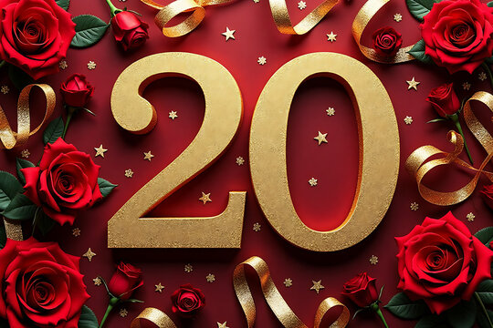 Elegant 20th anniversary celebration design with red roses, golden accents, and decorative ribbons.
