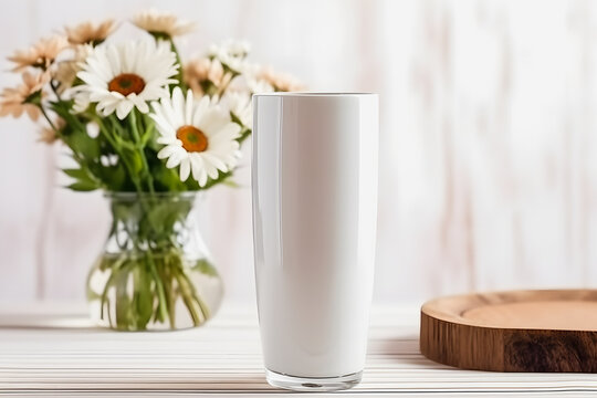 White Blank 20 oz Skinny Tumbler Mockup with Flower Vases: Professional Product Photography