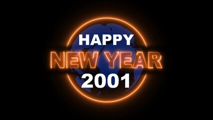 A neon sign displaying the year 2001 inside the words happy new year 4k video. Happy New Year 2001 Fireworks Celebration with world map globe rotation