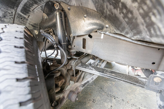 2004 American off-road classic 4x4  family turbo diesel truck underneath picture- axles, shock absorbers, yoke differential, muffler. High quality picture for download